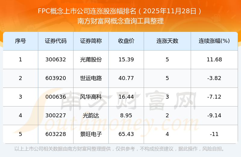 根据南方财富网概念查询工具数据统计,截止2025年11月28日收盘,FPC概念上市公司共有5只个股实现连涨。其中连续涨幅较大的个股有光莆股份、世运电路、风华高科等,连续涨幅分别为11.68%、-3.82%、-7.12%。