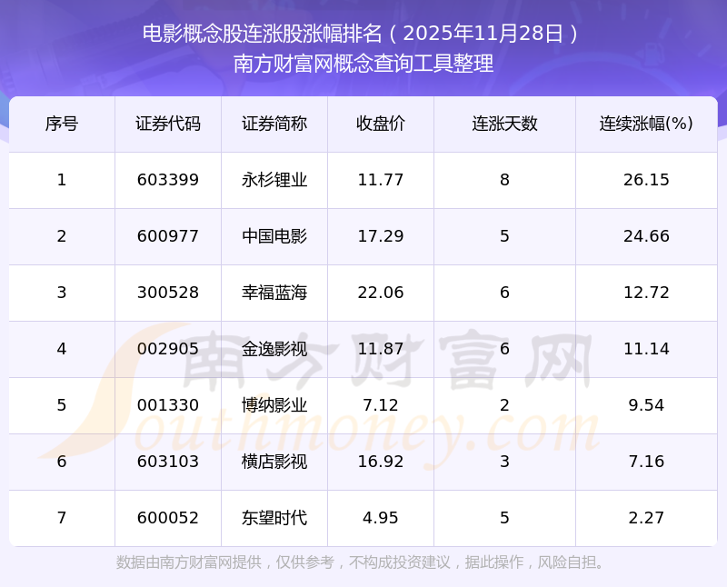 根据南方财富网概念查询工具数据统计,截止2025年11月28日收盘,电影概念股共有7只个股实现连涨。其中连续涨幅较大的个股有永杉锂业、中国电影、幸福蓝海等,连续涨幅分别为26.15%、24.66%、12.72%。