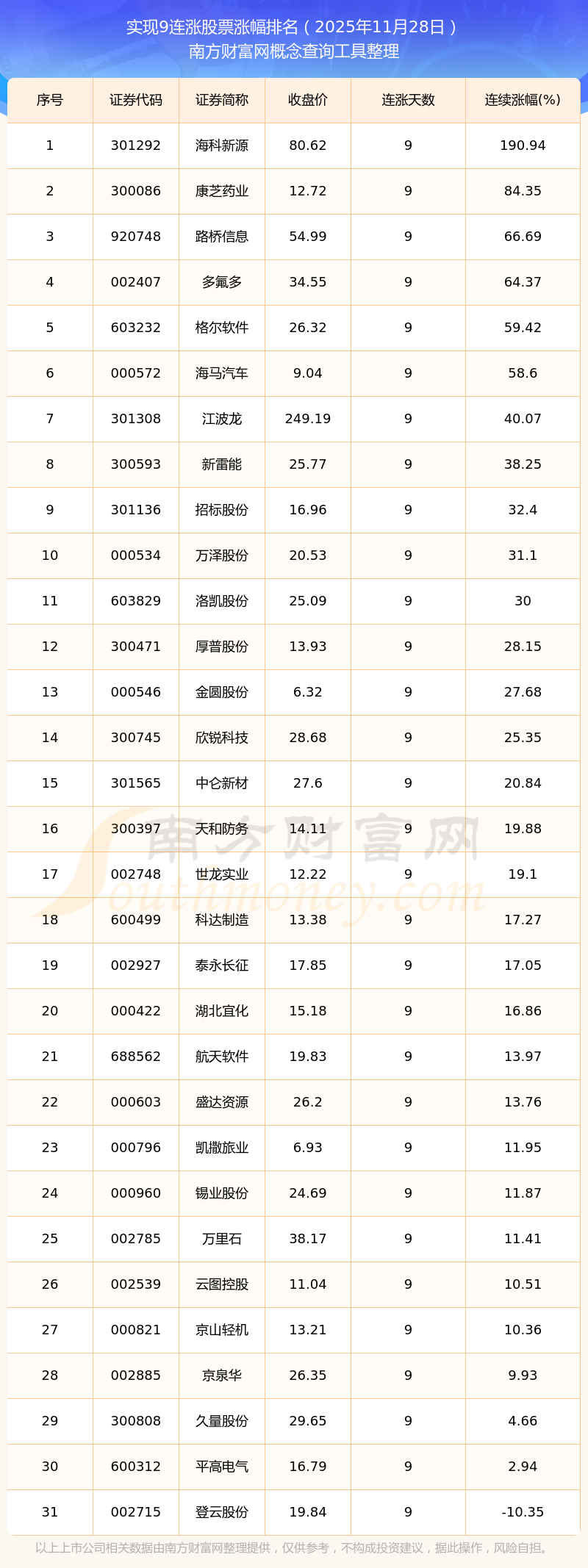 根据南方财富网概念查询工具数据统计,截止2025年11月28日收盘,共有31只个股实现9天连涨。其中连续涨幅较大的个股有海科新源、康芝药业、路桥信息等,连续涨幅分别为190.94%、84.35%、66.69%。