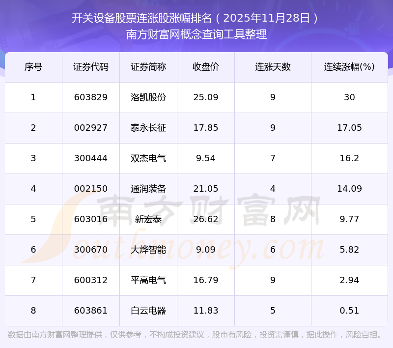 根据南方财富网概念查询工具数据统计,截止2025年11月28日收盘,开关设备股票共有8只个股实现连涨。其中连续涨幅较大的个股有洛凯股份、泰永长征、双杰电气等,连续涨幅分别为30.00%、17.05%、16.20%。