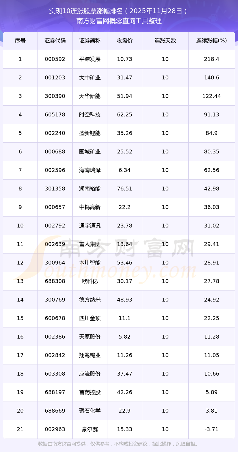 根据南方财富网概念查询工具数据统计,截止2025年11月28日收盘,共有21只个股实现10天连涨。其中连续涨幅较大的个股有平潭发展、大中矿业、天华新能等,连续涨幅分别为218.40%、140.60%、122.44%。
