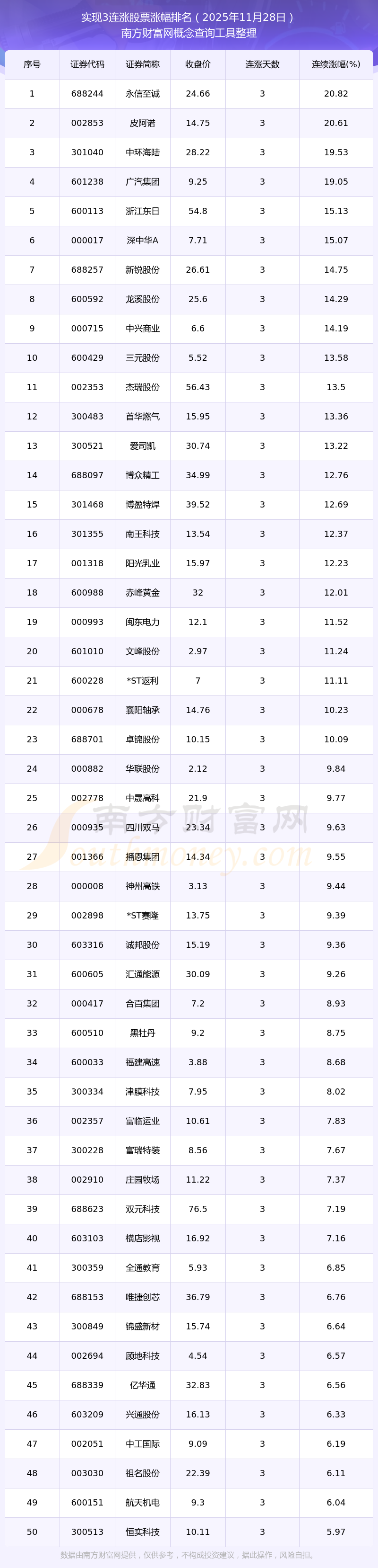 根据南方财富网概念查询工具数据统计,截止2025年11月28日收盘,共有146只个股实现3天连涨。其中连续涨幅较大的个股有永信至诚、皮阿诺、中环海陆等,连续涨幅分别为20.82%、20.61%、19.53%。