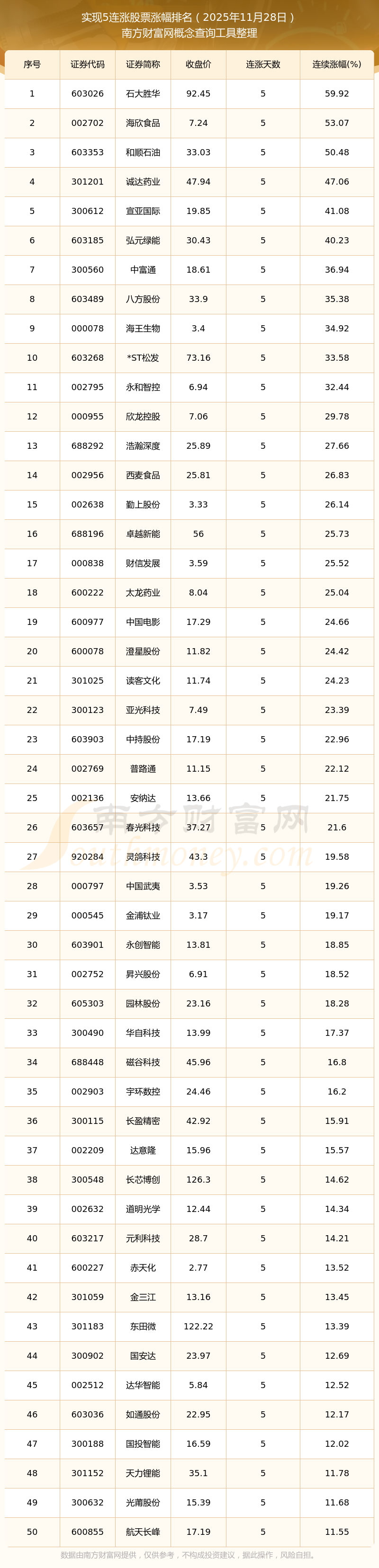 根据南方财富网概念查询工具数据统计,截止2025年11月28日收盘,共有131只个股实现5天连涨。其中连续涨幅较大的个股有石大胜华、海欣食品、和顺石油等,连续涨幅分别为59.92%、53.07%、50.48%。