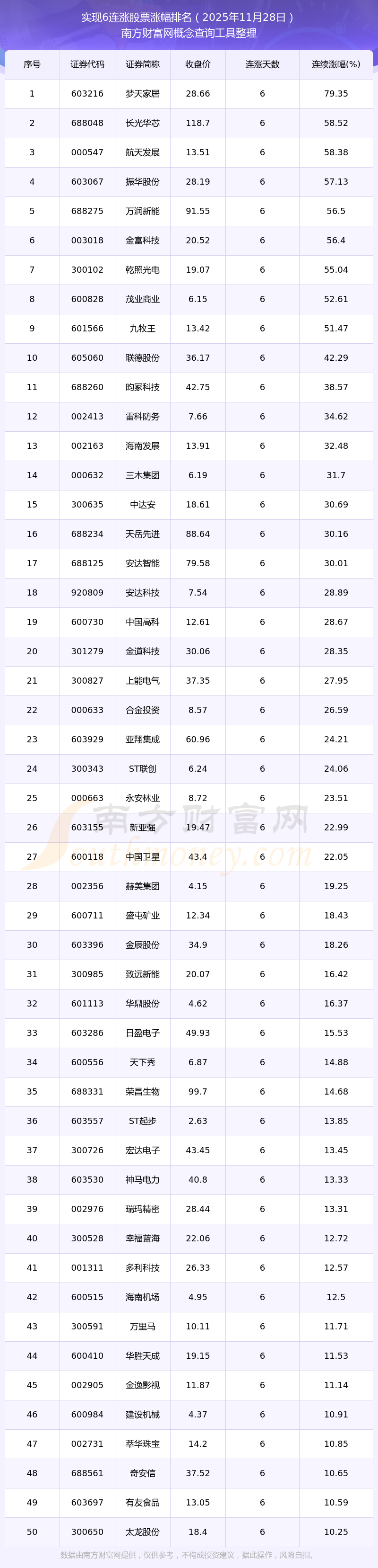 根据南方财富网概念查询工具数据统计,截止2025年11月28日收盘,共有85只个股实现6天连涨。其中连续涨幅较大的个股有梦天家居、长光华芯、航天发展等,连续涨幅分别为79.35%、58.52%、58.38%。