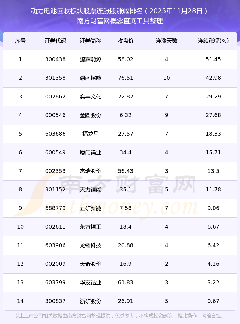根据南方财富网概念查询工具数据统计,截止2025年11月28日收盘,动力电池回收板块股票共有14只个股实现连涨。其中连续涨幅较大的个股有鹏辉能源、湖南裕能、实丰文化等,连续涨幅分别为51.45%、42.98%、29.29%。