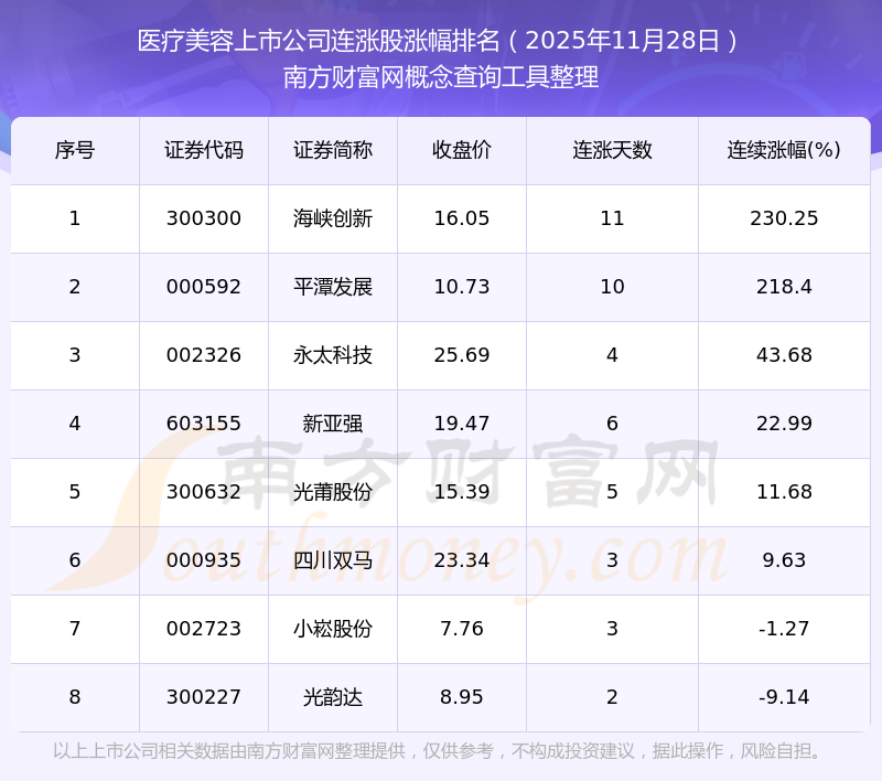 2025年11月28日医疗美容上市公司连涨股涨幅排名