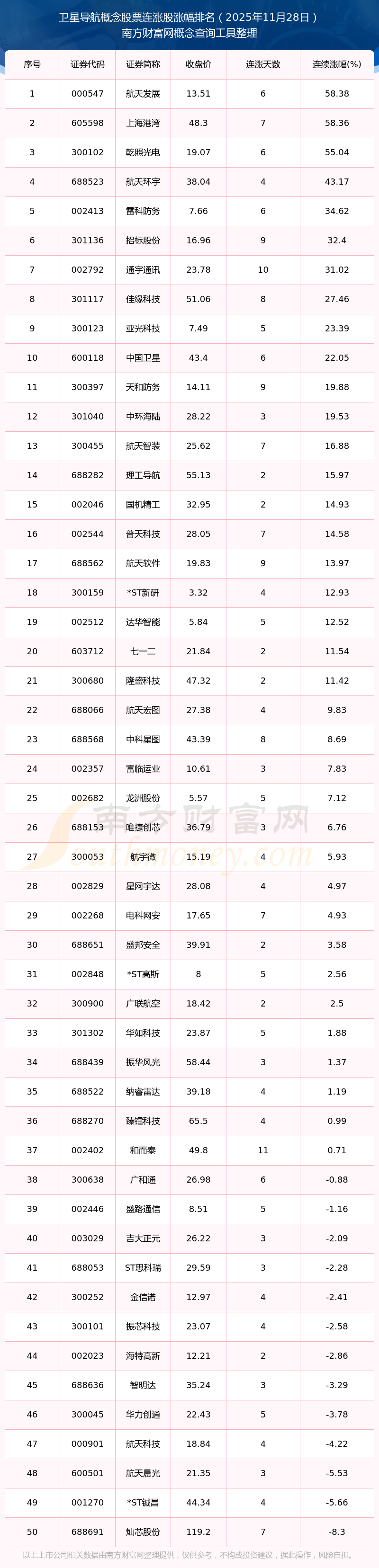 2025年11月28日卫星导航概念股票连涨股涨幅排名