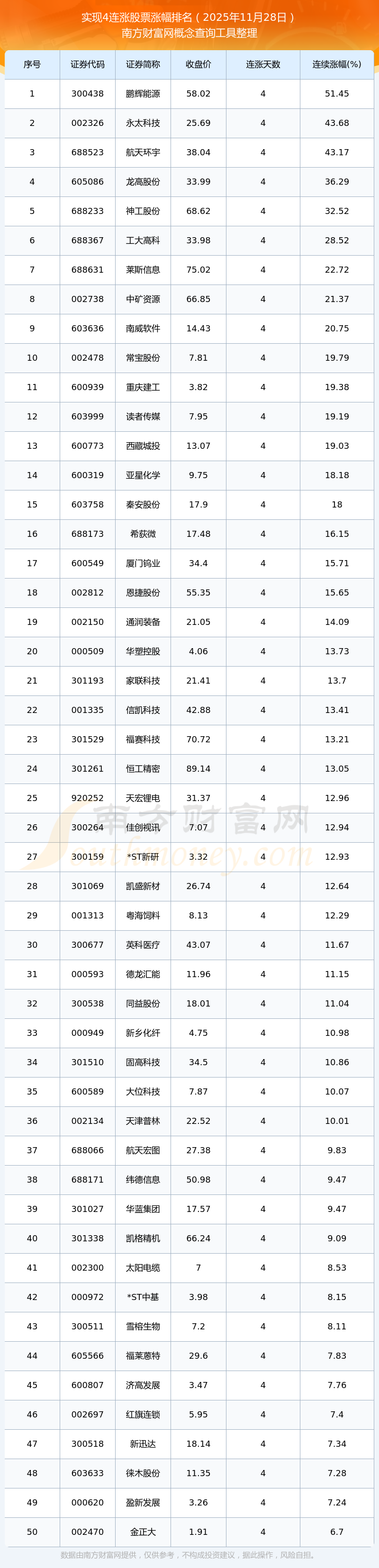 根据南方财富网概念查询工具数据统计,截止2025年11月28日收盘,共有137只个股实现4天连涨。其中连续涨幅较大的个股有鹏辉能源、永太科技、航天环宇等,连续涨幅分别为51.45%、43.68%、43.17%。