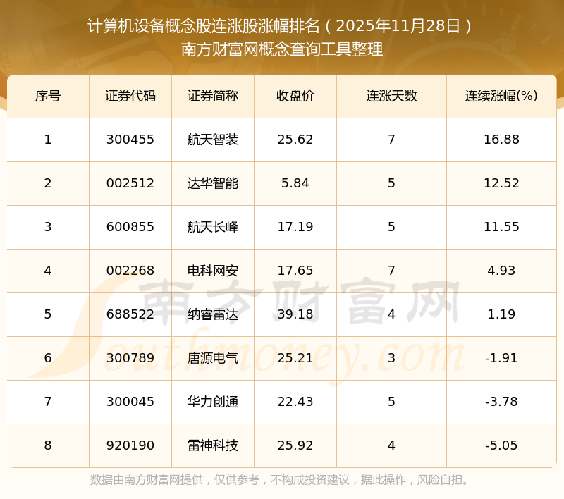 根据南方财富网概念查询工具数据统计,截止2025年11月28日收盘,计算机设备概念股共有8只个股实现连涨。其中连续涨幅较大的个股有航天智装、达华智能、航天长峰等,连续涨幅分别为16.88%、12.52%、11.55%。