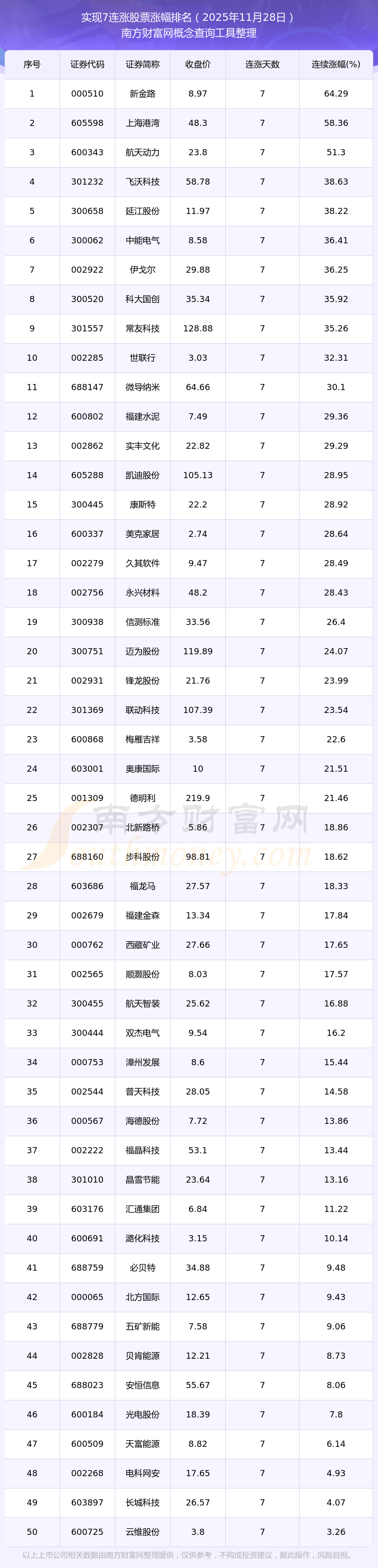 2025年11月28日实现7连涨股票涨幅排名