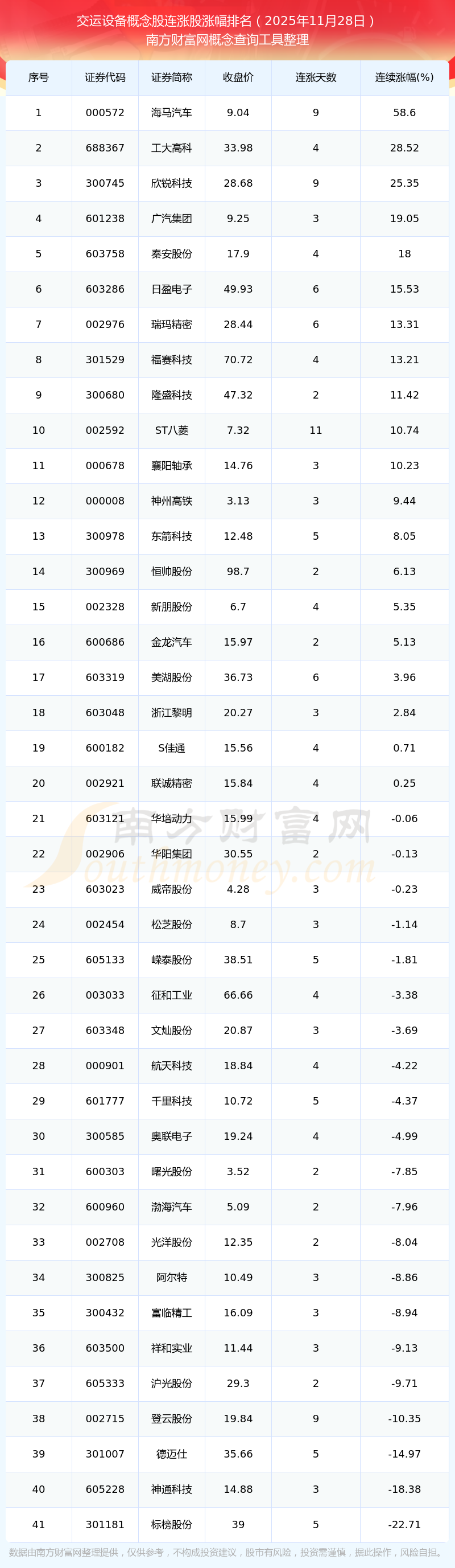 根据南方财富网概念查询工具数据统计,截止2025年11月28日收盘,交运设备概念股共有41只个股实现连涨。其中连续涨幅较大的个股有海马汽车、工大高科、欣锐科技等,连续涨幅分别为58.60%、28.52%、25.35%。