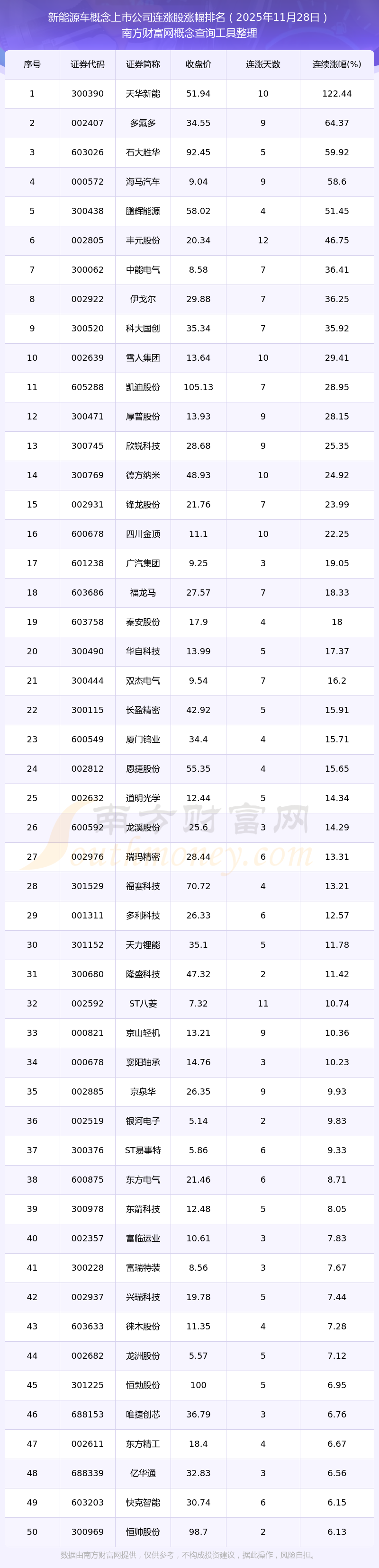 根据南方财富网概念查询工具数据统计,截止2025年11月28日收盘,新能源车概念上市公司共有106只个股实现连涨。其中连续涨幅较大的个股有天华新能、多氟多、石大胜华等,连续涨幅分别为122.44%、64.37%、59.92%。