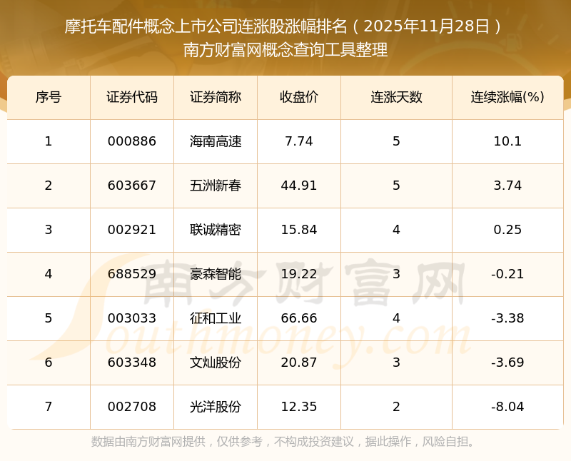 根据南方财富网概念查询工具数据统计,截止2025年11月28日收盘,摩托车配件概念上市公司共有7只个股实现连涨。其中连续涨幅较大的个股有海南高速、五洲新春、联诚精密等,连续涨幅分别为10.10%、3.74%、0.25%。