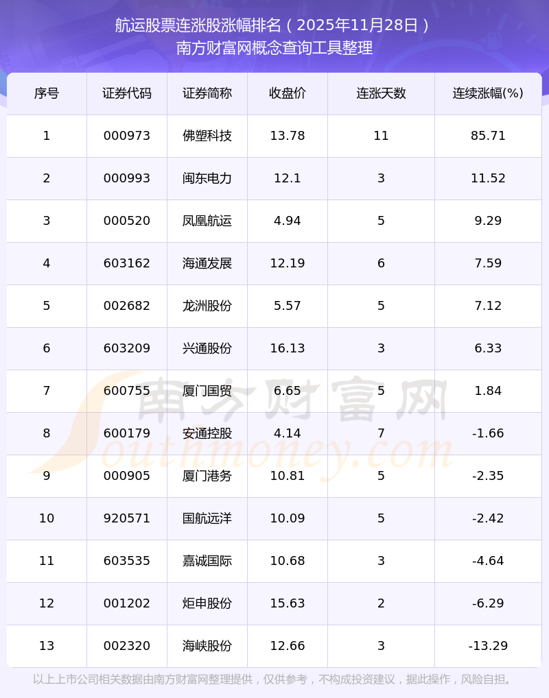 根据南方财富网概念查询工具数据统计,截止2025年11月28日收盘,航运股票共有13只个股实现连涨。其中连续涨幅较大的个股有佛塑科技、闽东电力、凤凰航运等,连续涨幅分别为85.71%、11.52%、9.29%。