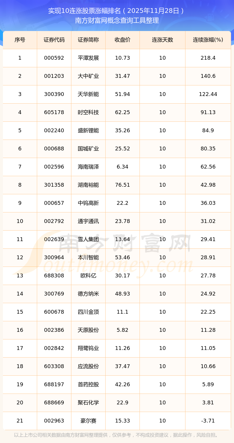 根据南方财富网概念查询工具数据统计,截止2025年11月28日收盘,共有21只个股实现10天连涨。其中连续涨幅较大的个股有平潭发展、大中矿业、天华新能等,连续涨幅分别为218.40%、140.60%、122.44%。
