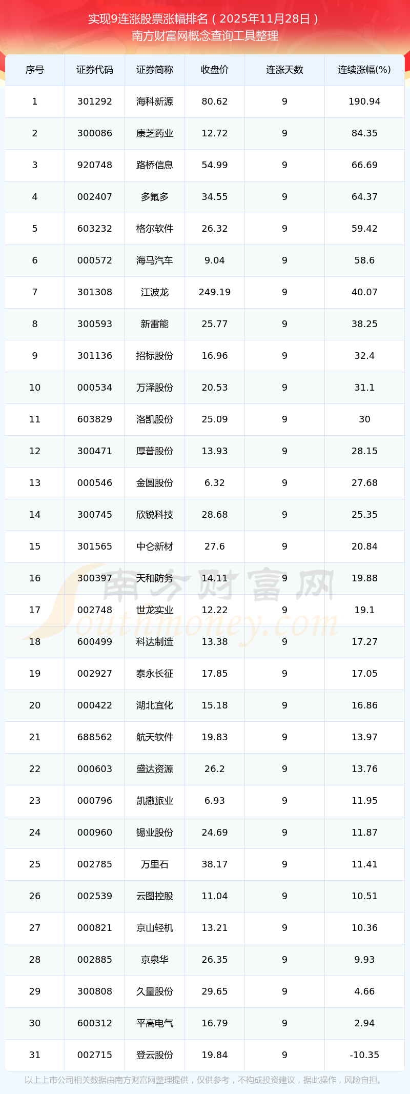 根据南方财富网概念查询工具数据统计,截止2025年11月28日收盘,共有31只个股实现9天连涨。其中连续涨幅较大的个股有海科新源、康芝药业、路桥信息等,连续涨幅分别为190.94%、84.35%、66.69%。