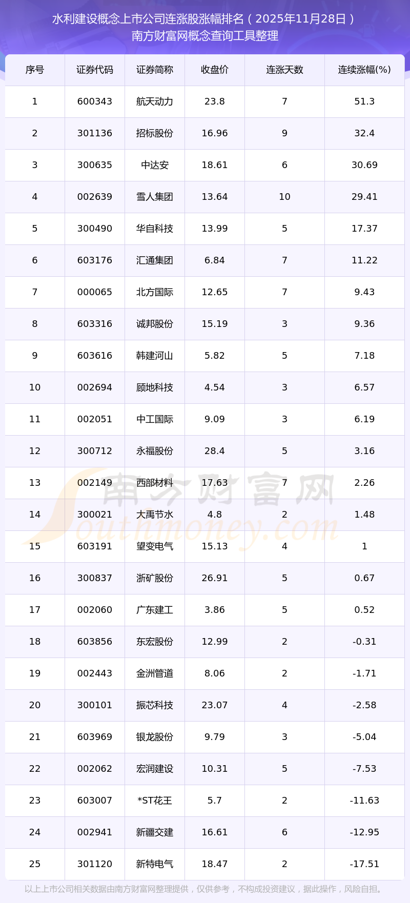 根据南方财富网概念查询工具数据统计,截止2025年11月28日收盘,水利建设概念上市公司共有25只个股实现连涨。其中连续涨幅较大的个股有航天动力、招标股份、中达安等,连续涨幅分别为51.30%、32.40%、30.69%。