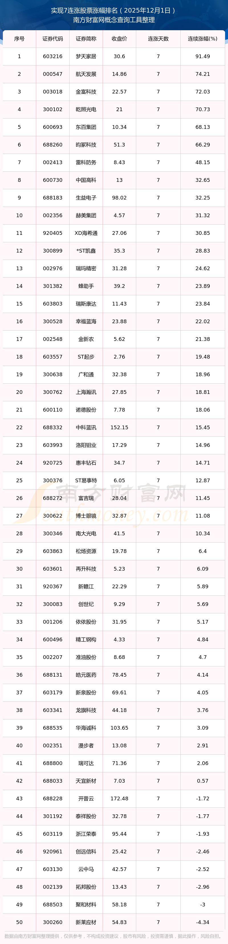 根据南方财富网概念查询工具数据统计,截止2025年12月1日收盘,共有53只个股实现7天连涨。其中连续涨幅较大的个股有梦天家居、航天发展、金富科技等,连续涨幅分别为91.49%、74.21%、72.03%。