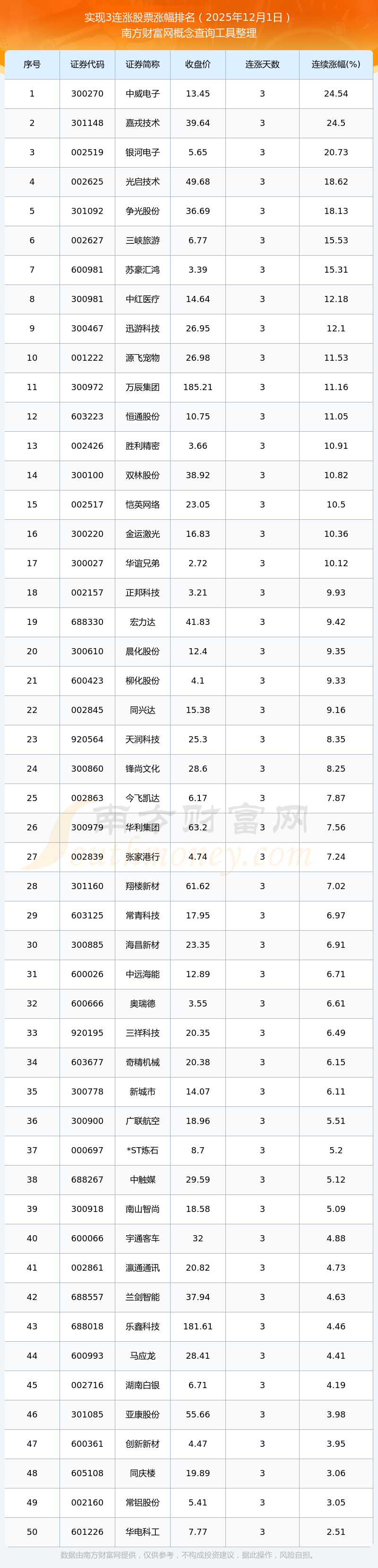 根据南方财富网概念查询工具数据统计,截止2025年12月1日收盘,共有129只个股实现3天连涨。其中连续涨幅较大的个股有中威电子、嘉戎技术、银河电子等,连续涨幅分别为24.54%、24.50%、20.73%。