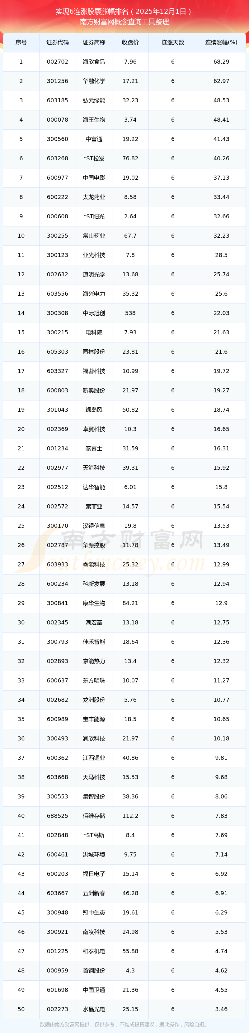 根据南方财富网概念查询工具数据统计,截止2025年12月1日收盘,共有74只个股实现6天连涨。其中连续涨幅较大的个股有海欣食品、华融化学、弘元绿能等,连续涨幅分别为68.29%、62.97%、48.53%。