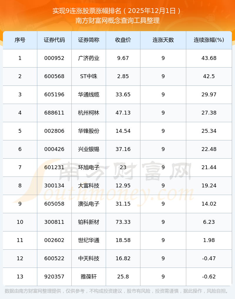 根据南方财富网概念查询工具数据统计,截止2025年12月1日收盘,共有13只个股实现9天连涨。其中连续涨幅较大的个股有广济药业、ST中珠、华通线缆等,连续涨幅分别为43.68%、42.50%、29.97%。
