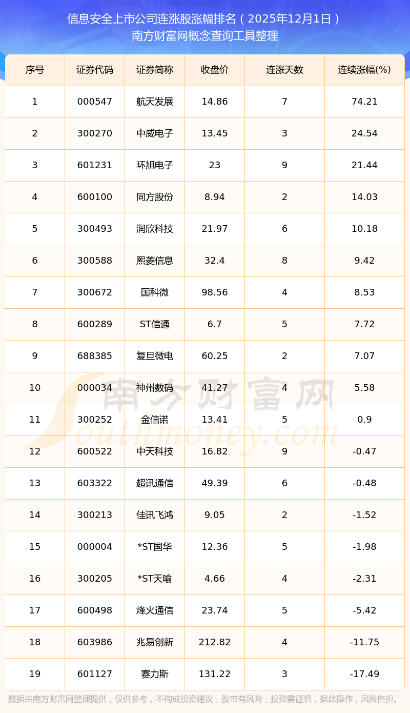 2025年12月1日信息安全上市公司连涨股涨幅排名