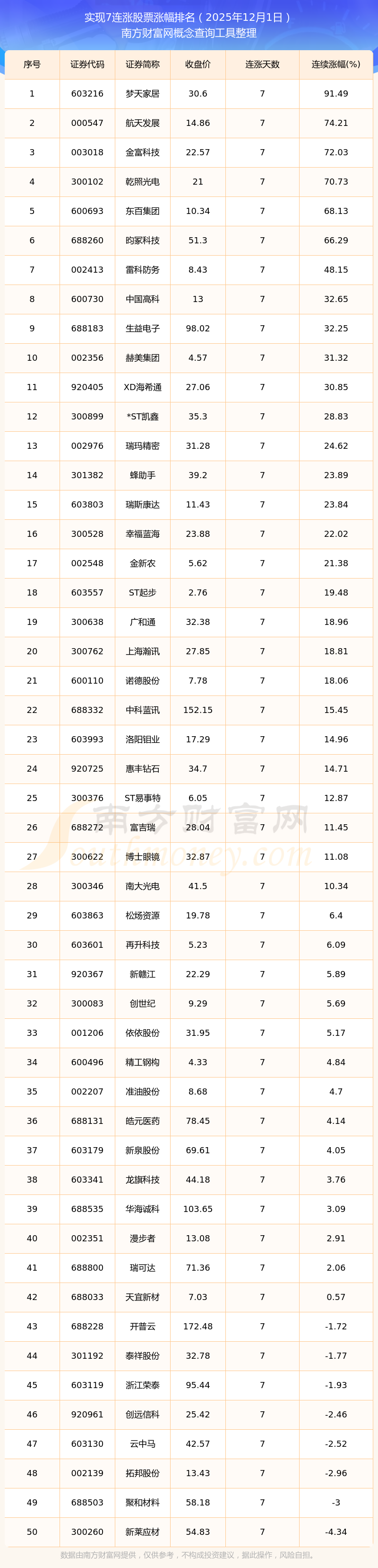 根据南方财富网概念查询工具数据统计,截止2025年12月1日收盘,共有53只个股实现7天连涨。其中连续涨幅较大的个股有梦天家居、航天发展、金富科技等,连续涨幅分别为91.49%、74.21%、72.03%。