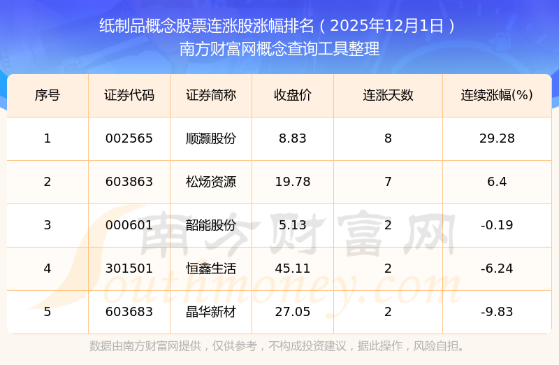 根据南方财富网概念查询工具数据统计,截止2025年12月1日收盘,纸制品概念股票共有5只个股实现连涨。其中连续涨幅较大的个股有顺灏股份、松炀资源、韶能股份等,连续涨幅分别为29.28%、6.40%、-0.19%。