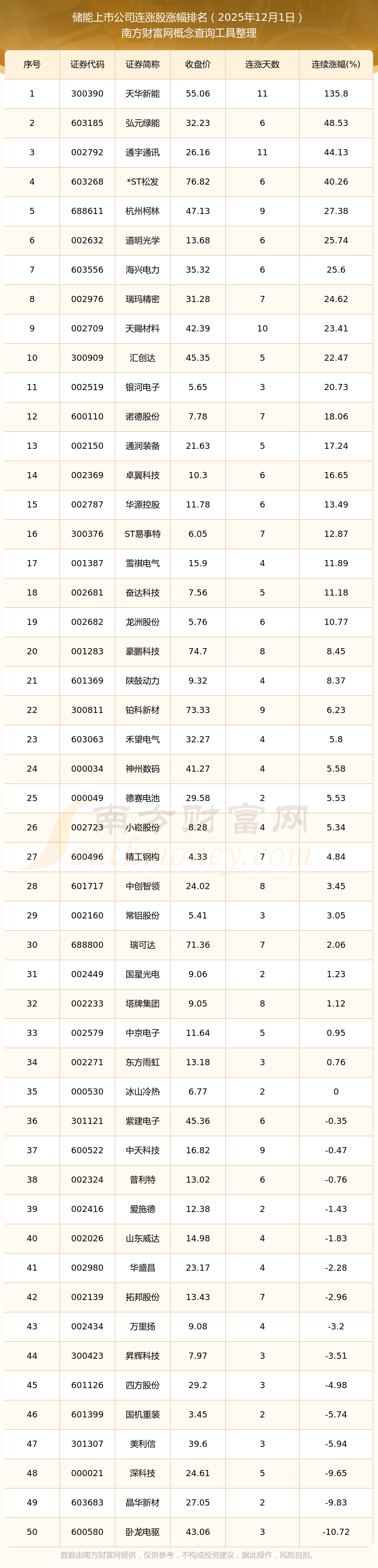 根据南方财富网概念查询工具数据统计,截止2025年12月1日收盘,储能上市公司共有52只个股实现连涨。其中连续涨幅较大的个股有天华新能、弘元绿能、通宇通讯等,连续涨幅分别为135.80%、48.53%、44.13%。