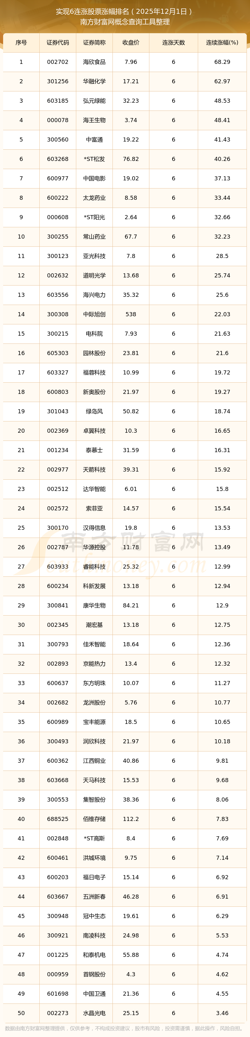 根据南方财富网概念查询工具数据统计,截止2025年12月1日收盘,共有74只个股实现6天连涨。其中连续涨幅较大的个股有海欣食品、华融化学、弘元绿能等,连续涨幅分别为68.29%、62.97%、48.53%。