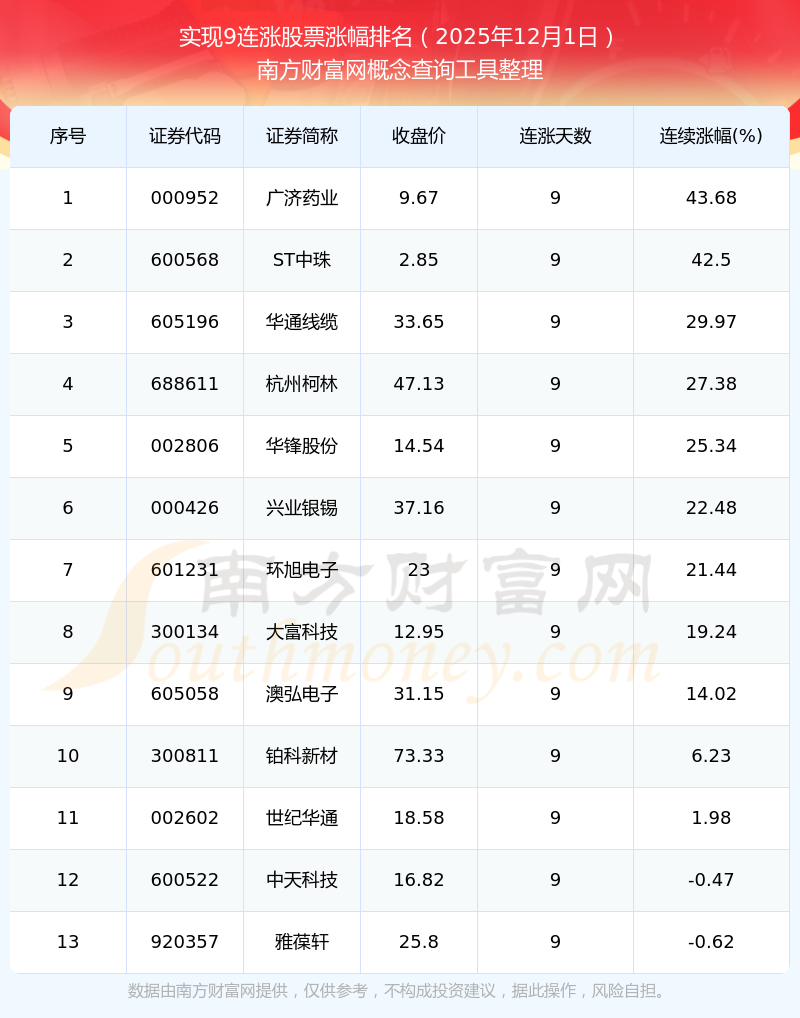 根据南方财富网概念查询工具数据统计,截止2025年12月1日收盘,共有13只个股实现9天连涨。其中连续涨幅较大的个股有广济药业、ST中珠、华通线缆等,连续涨幅分别为43.68%、42.50%、29.97%。