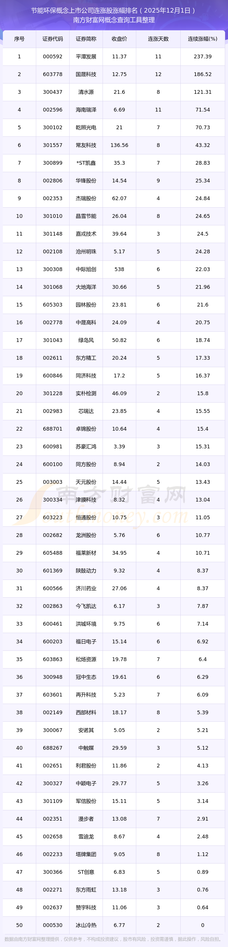 根据南方财富网概念查询工具数据统计,截止2025年12月1日收盘,节能环保概念上市公司共有66只个股实现连涨。其中连续涨幅较大的个股有平潭发展、国晟科技、清水源等,连续涨幅分别为237.39%、186.52%、121.31%。
