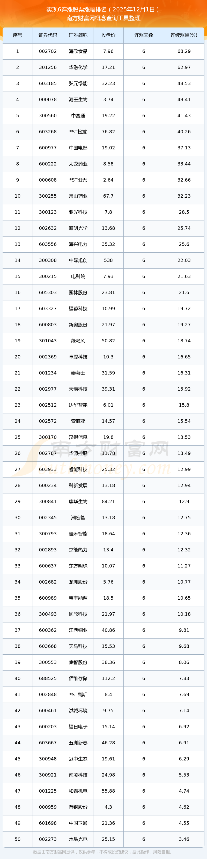 根据南方财富网概念查询工具数据统计,截止2025年12月1日收盘,共有74只个股实现6天连涨。其中连续涨幅较大的个股有海欣食品、华融化学、弘元绿能等,连续涨幅分别为68.29%、62.97%、48.53%。