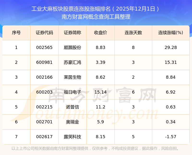 根据南方财富网概念查询工具数据统计,截止2025年12月1日收盘,工业大麻板块股票共有7只个股实现连涨。其中连续涨幅较大的个股有顺灏股份、苏豪汇鸿、莱茵生物等,连续涨幅分别为29.28%、15.31%、8.84%。