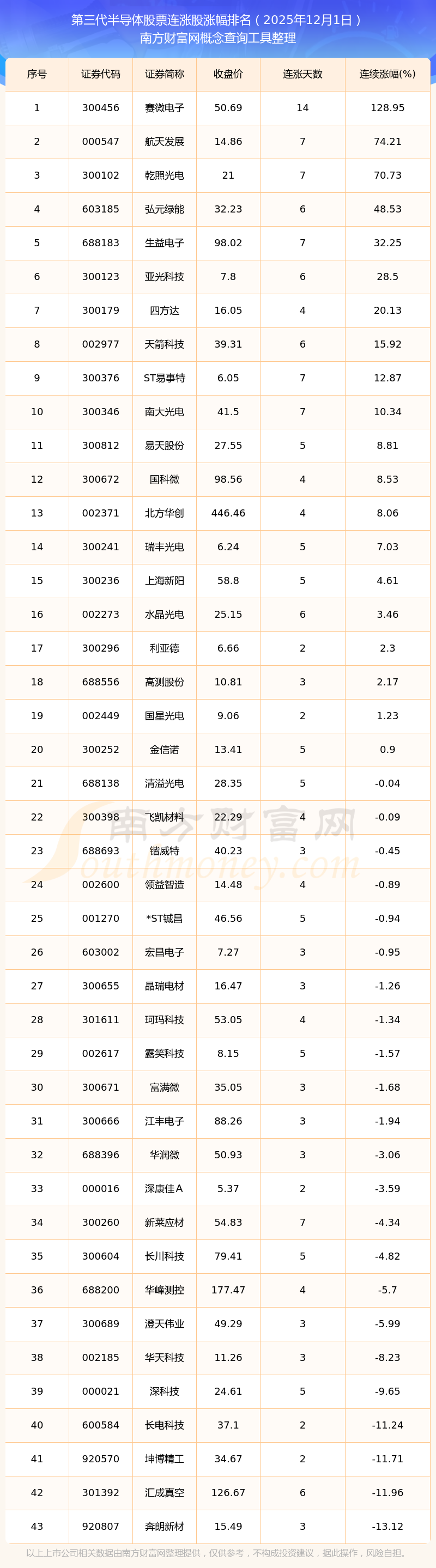 2025年12月1日第三代半导体股票连涨股涨幅排名
