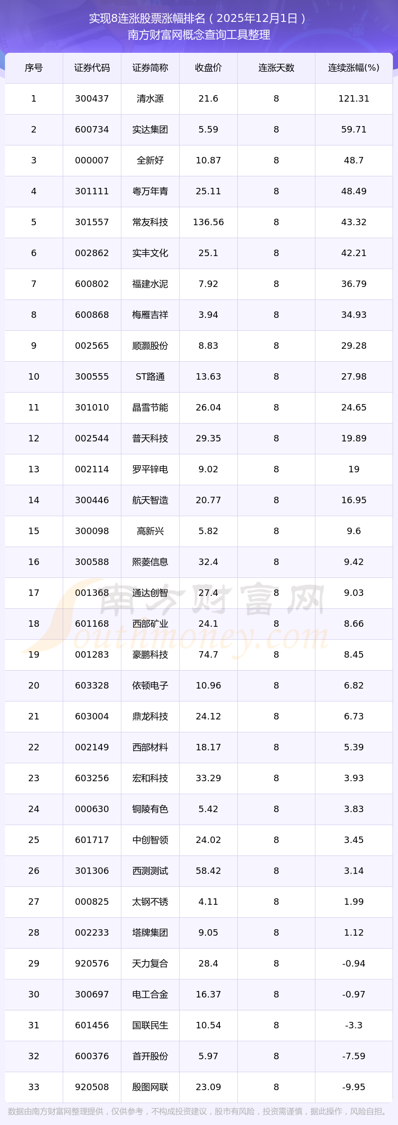 根据南方财富网概念查询工具数据统计,截止2025年12月1日收盘,共有33只个股实现8天连涨。其中连续涨幅较大的个股有清水源、实达集团、全新好等,连续涨幅分别为121.31%、59.71%、48.70%。
