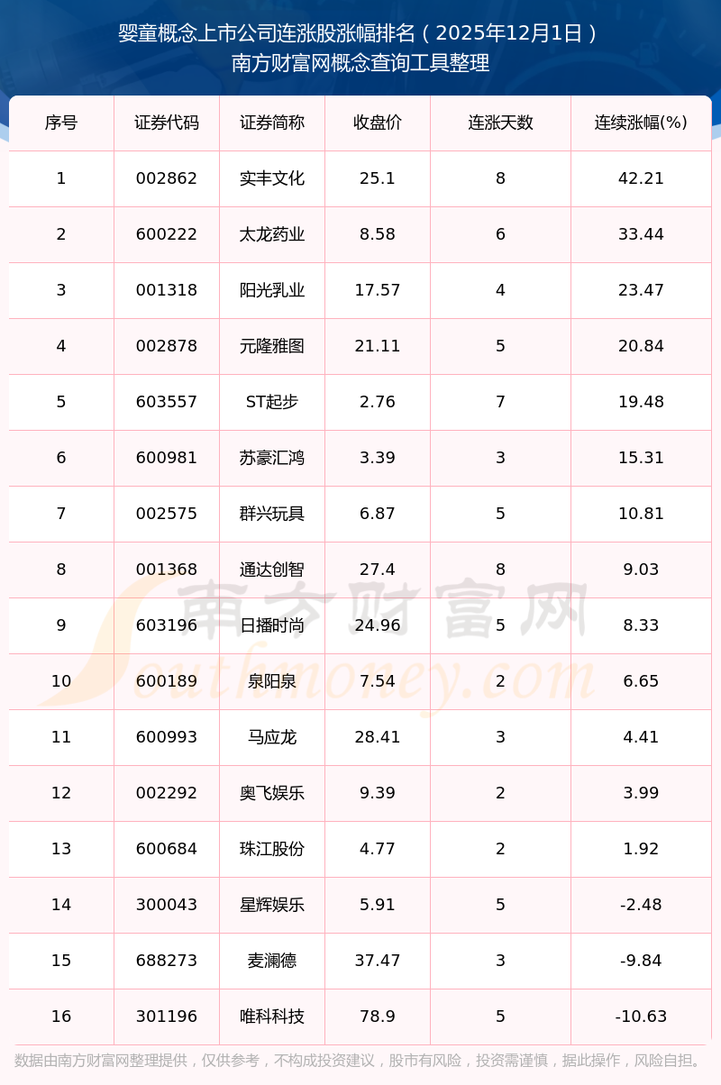 2025年12月1日婴童概念上市公司连涨股涨幅排名