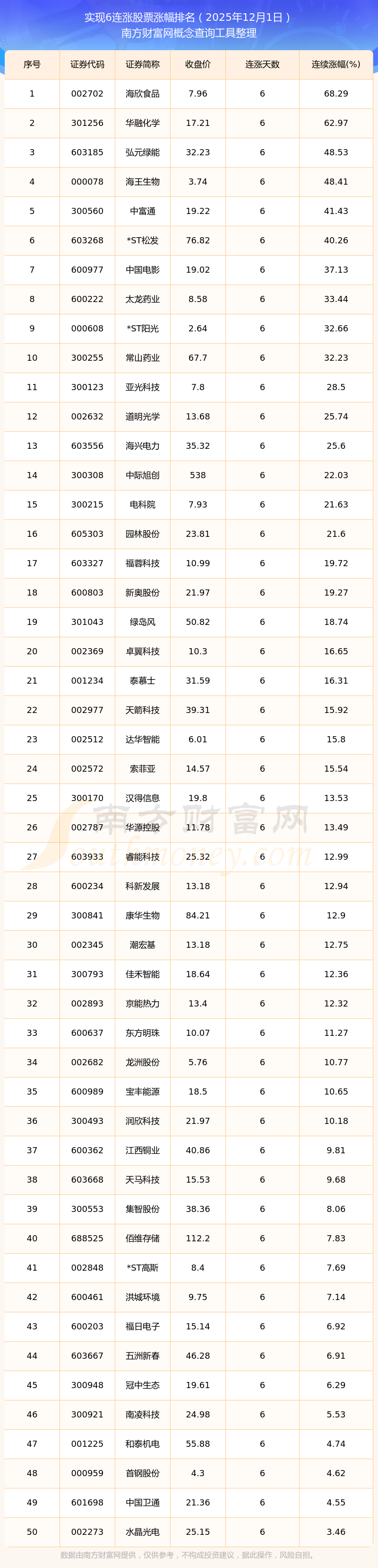 根据南方财富网概念查询工具数据统计,截止2025年12月1日收盘,共有74只个股实现6天连涨。其中连续涨幅较大的个股有海欣食品、华融化学、弘元绿能等,连续涨幅分别为68.29%、62.97%、48.53%。