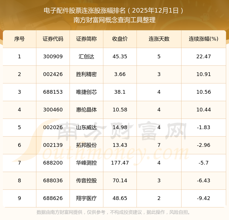 根据南方财富网概念查询工具数据统计,截止2025年12月1日收盘,电子配件股票共有9只个股实现连涨。其中连续涨幅较大的个股有汇创达、胜利精密、唯捷创芯等,连续涨幅分别为22.47%、10.91%、10.56%。