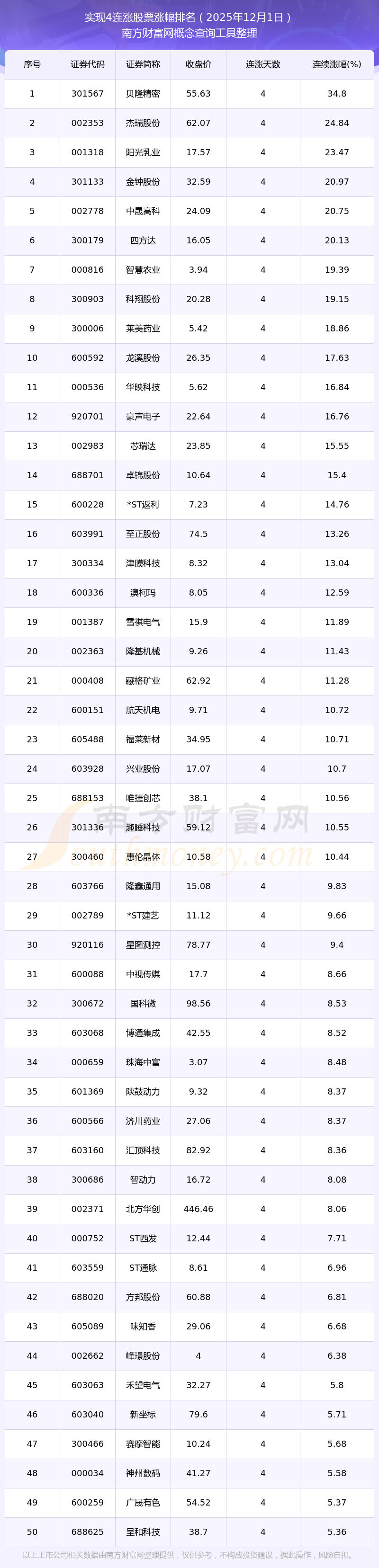 根据南方财富网概念查询工具数据统计,截止2025年12月1日收盘,共有121只个股实现4天连涨。其中连续涨幅较大的个股有贝隆精密、杰瑞股份、阳光乳业等,连续涨幅分别为34.80%、24.84%、23.47%。