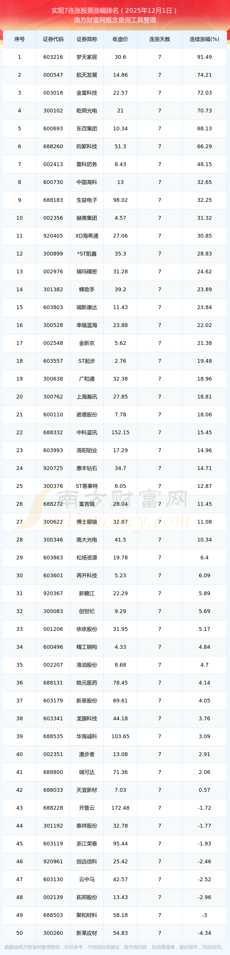 根据南方财富网概念查询工具数据统计,截止2025年12月1日收盘,共有53只个股实现7天连涨。其中连续涨幅较大的个股有梦天家居、航天发展、金富科技等,连续涨幅分别为91.49%、74.21%、72.03%。