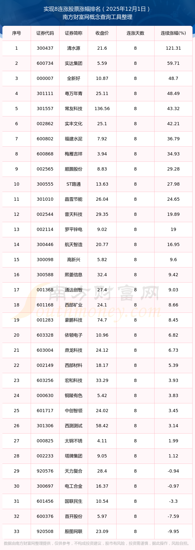 根据南方财富网概念查询工具数据统计,截止2025年12月1日收盘,共有33只个股实现8天连涨。其中连续涨幅较大的个股有清水源、实达集团、全新好等,连续涨幅分别为121.31%、59.71%、48.70%。