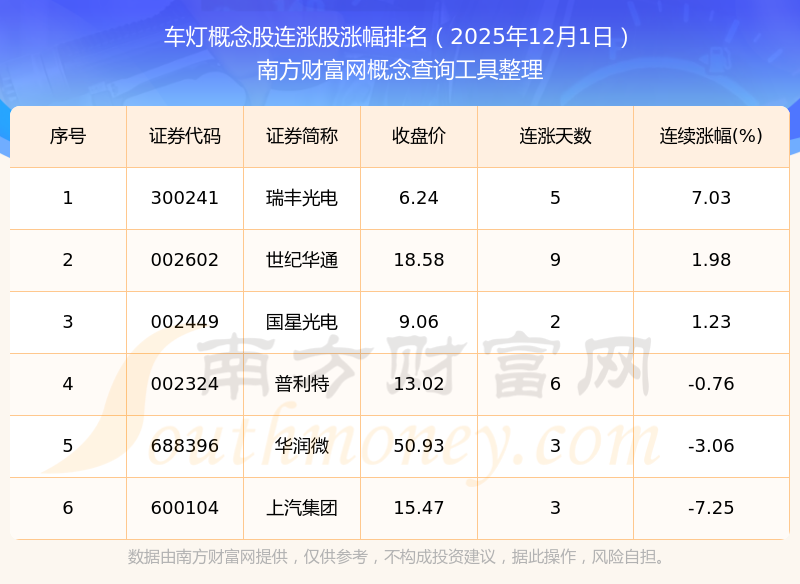 根据南方财富网概念查询工具数据统计,截止2025年12月1日收盘,车灯概念股共有6只个股实现连涨。其中连续涨幅较大的个股有瑞丰光电、世纪华通、国星光电等,连续涨幅分别为7.03%、1.98%、1.23%。