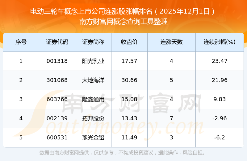 根据南方财富网概念查询工具数据统计,截止2025年12月1日收盘,电动三轮车概念上市公司共有5只个股实现连涨。其中连续涨幅较大的个股有阳光乳业、大地海洋、隆鑫通用等,连续涨幅分别为23.47%、21.96%、9.83%。