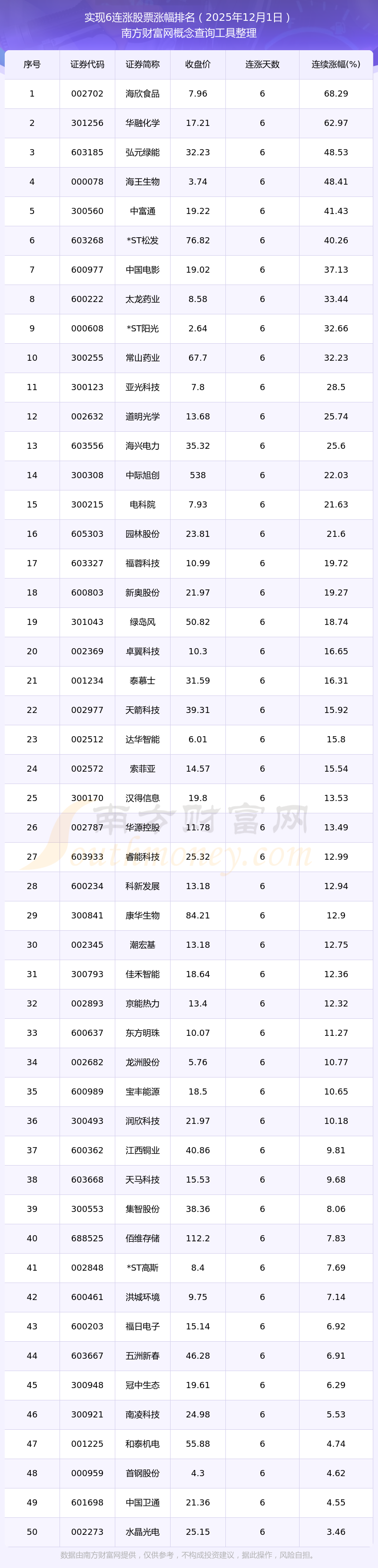 根据南方财富网概念查询工具数据统计,截止2025年12月1日收盘,共有74只个股实现6天连涨。其中连续涨幅较大的个股有海欣食品、华融化学、弘元绿能等,连续涨幅分别为68.29%、62.97%、48.53%。