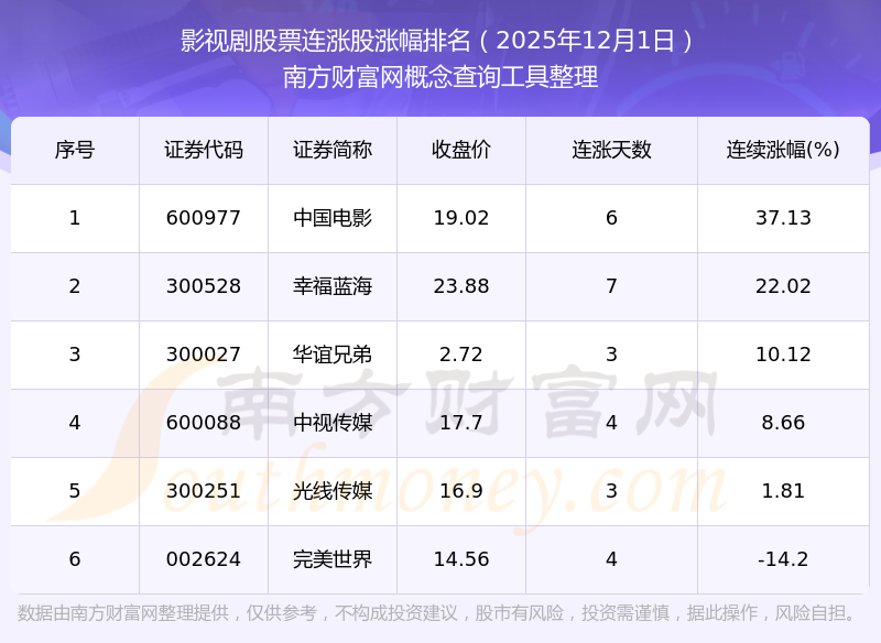 根据南方财富网概念查询工具数据统计,截止2025年12月1日收盘,影视剧股票共有6只个股实现连涨。其中连续涨幅较大的个股有中国电影、幸福蓝海、华谊兄弟等,连续涨幅分别为37.13%、22.02%、10.12%。