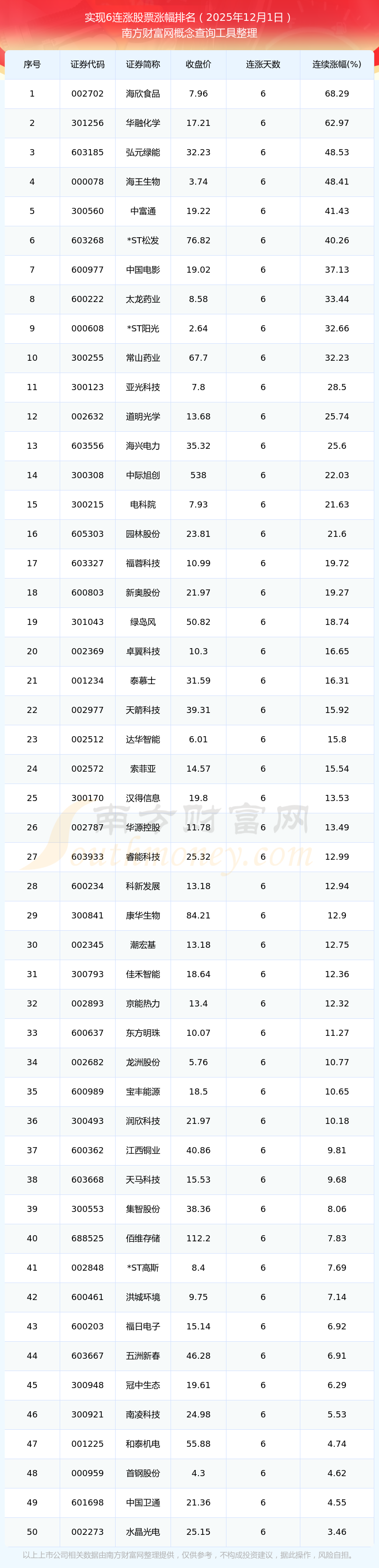 根据南方财富网概念查询工具数据统计,截止2025年12月1日收盘,共有74只个股实现6天连涨。其中连续涨幅较大的个股有海欣食品、华融化学、弘元绿能等,连续涨幅分别为68.29%、62.97%、48.53%。