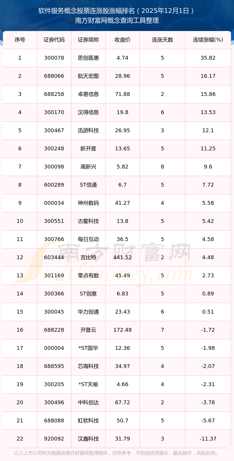 2025年12月1日软件服务概念股票连涨股票涨幅排名