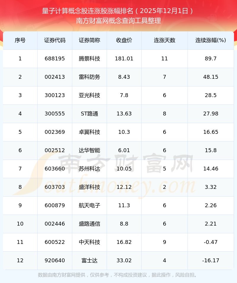 根据南方财富网概念查询工具数据统计,截止2025年12月1日收盘,量子计算概念股共有12只个股实现连涨。其中连续涨幅较大的个股有腾景科技、雷科防务、亚光科技等,连续涨幅分别为89.70%、48.15%、28.50%。
