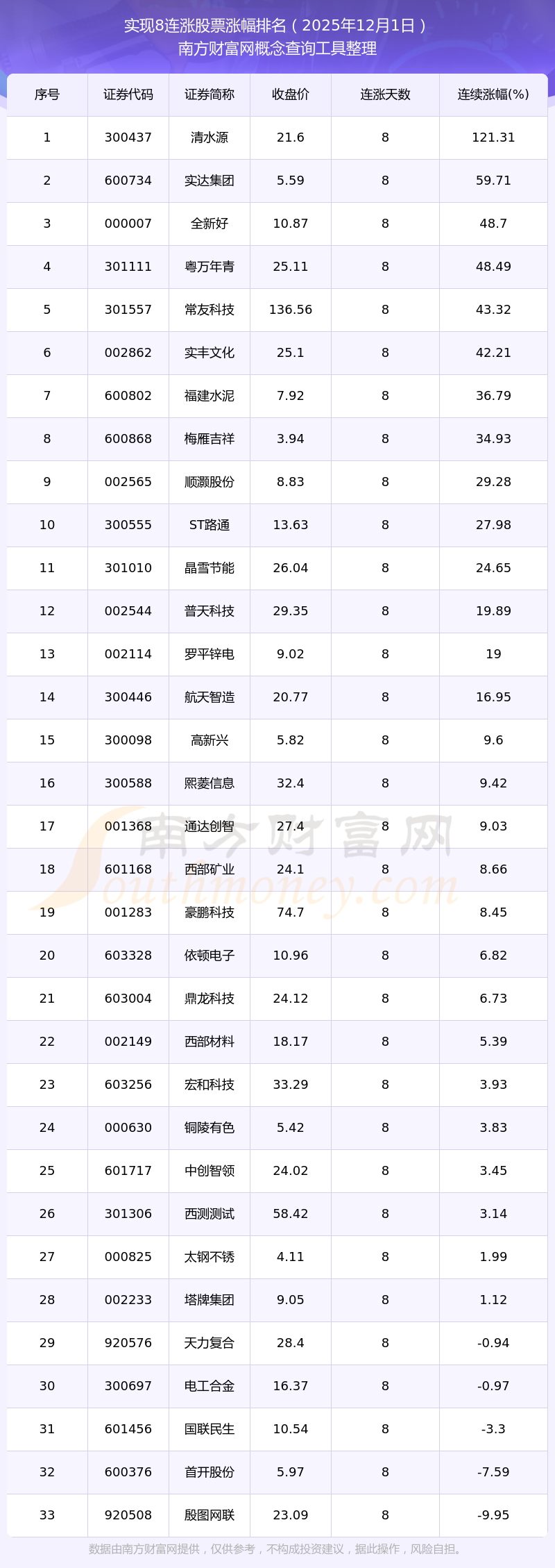 根据南方财富网概念查询工具数据统计,截止2025年12月1日收盘,共有33只个股实现8天连涨。其中连续涨幅较大的个股有清水源、实达集团、全新好等,连续涨幅分别为121.31%、59.71%、48.70%。